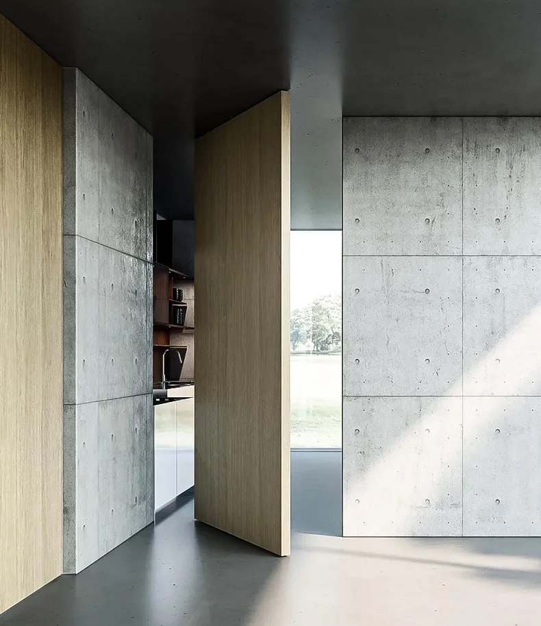 Mitica is sleek and frameless. The pivot hinge is less visible, making the door look like a part of the wall. It suits designs that focus on simplicity.